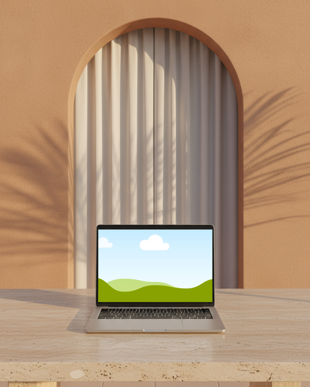 Sous la lumière ocre de Marrakech, le Kasbah Glow MacBook Mockup capture la quiétude d’un instant suspendu au cœur d’un riad marocain.